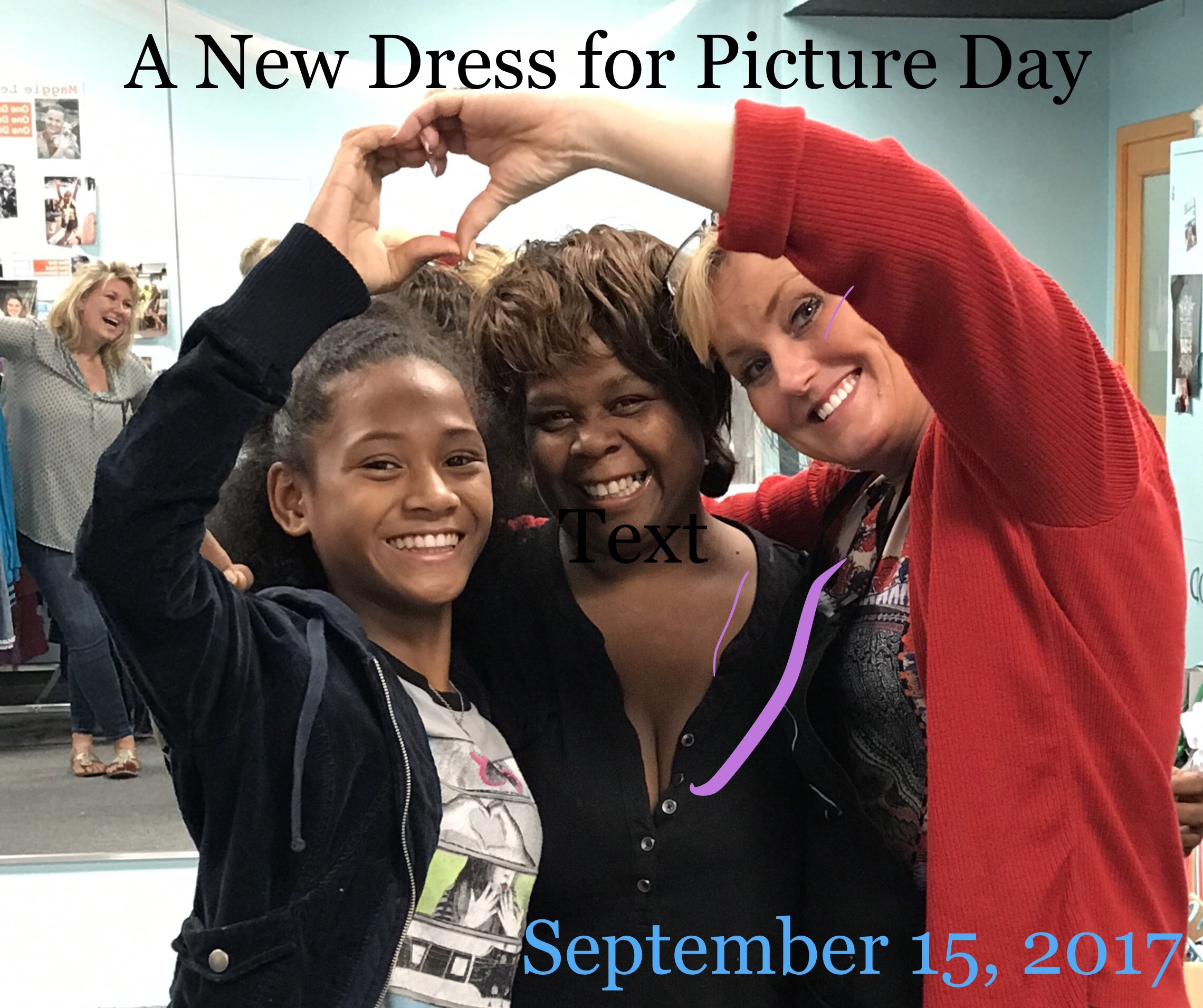 Soon after we opened a lady came by with a referral from Catholic Charities. She filled out the application and I asked if her child was with her. She was not but returned with her in an hour. Denise was so precious and when we three learned that she had Picture Day tomorrow we were the freaking Cinderella mice. We all brought dresses, Lisa found shoes and Sharon had the perfect finishing touch- a fringy bag from her daughter she had brought that day.