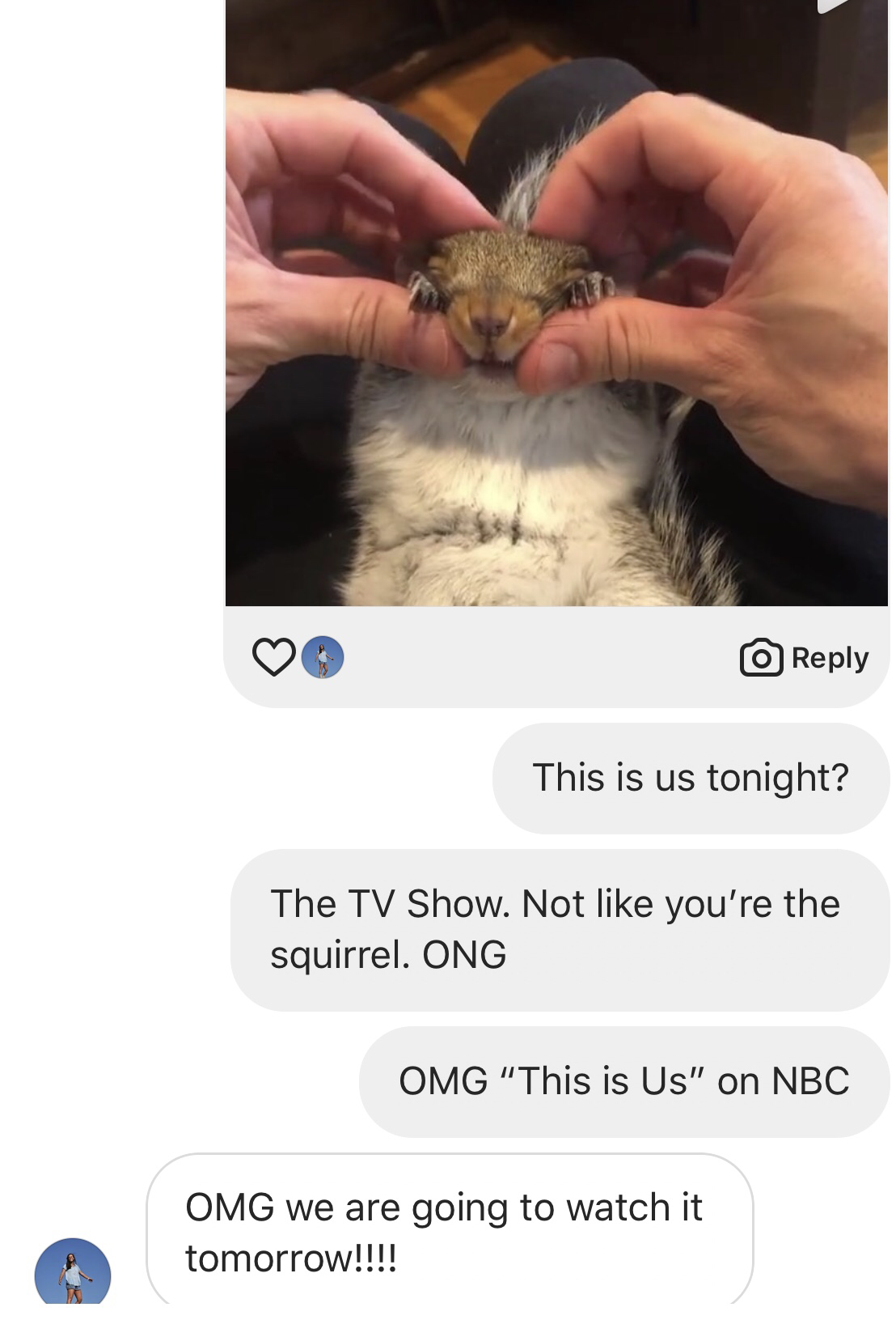 I was asking about The SHOW This is Us THE SHOW. Are you watching it tonight? Nothing related to squirrel massage. I promise!